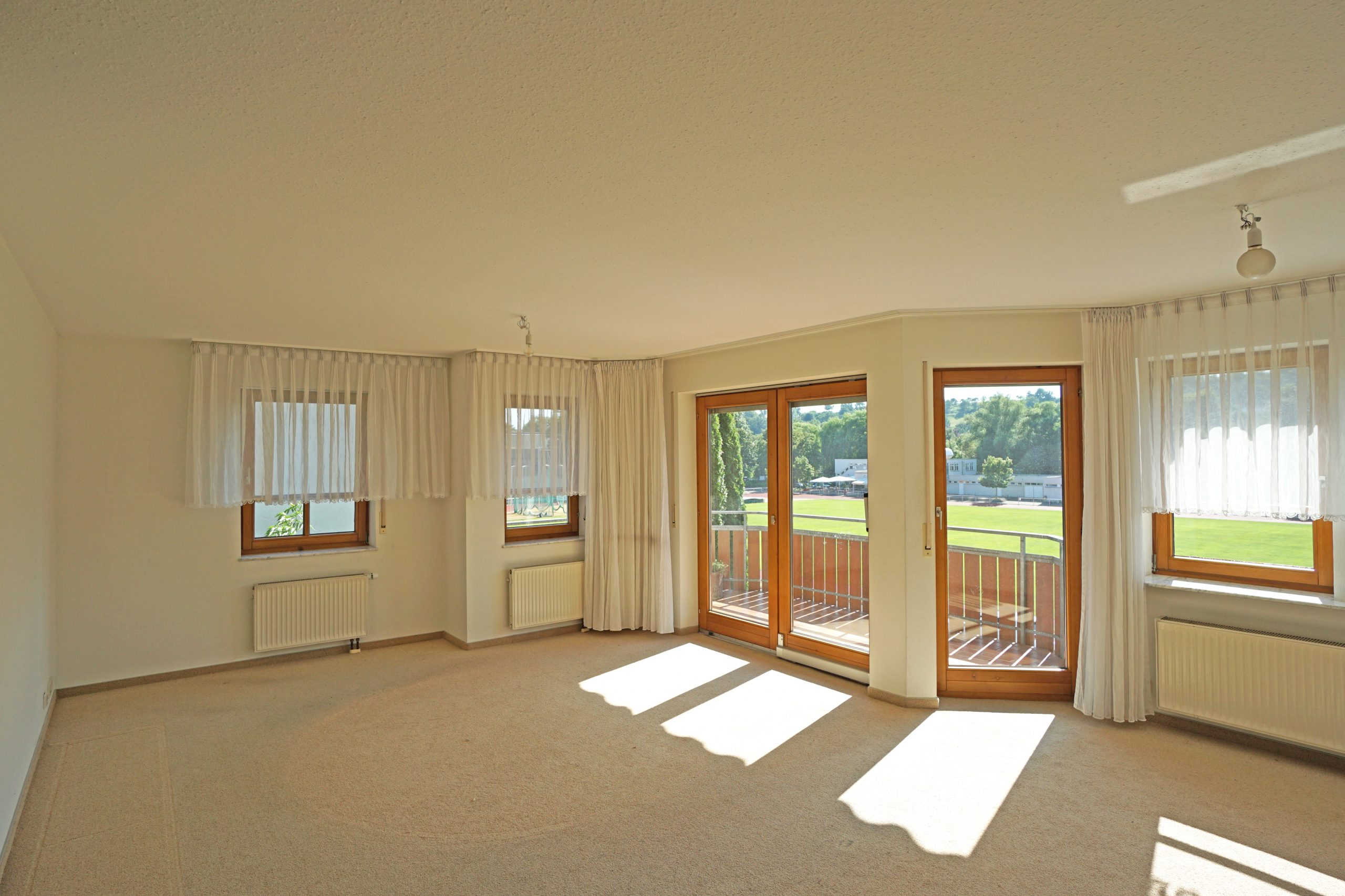 Die angenehm große Eingangsdiele verfügt über eine Garderobe und öffnet sich zum äußerst weitläufigen Wohn- und Essbereich. Dieser lässt in Richtung Stellmöglichkeiten keine Wünsche offen. Die vielen Fenster und Fenstertüren sorgen für eine helle, angenehme Atmosphäre. Von hier aus gelangen Sie auch auf den Balkon (West-Ausrichtung), wo sich die Aussicht genießen lässt.