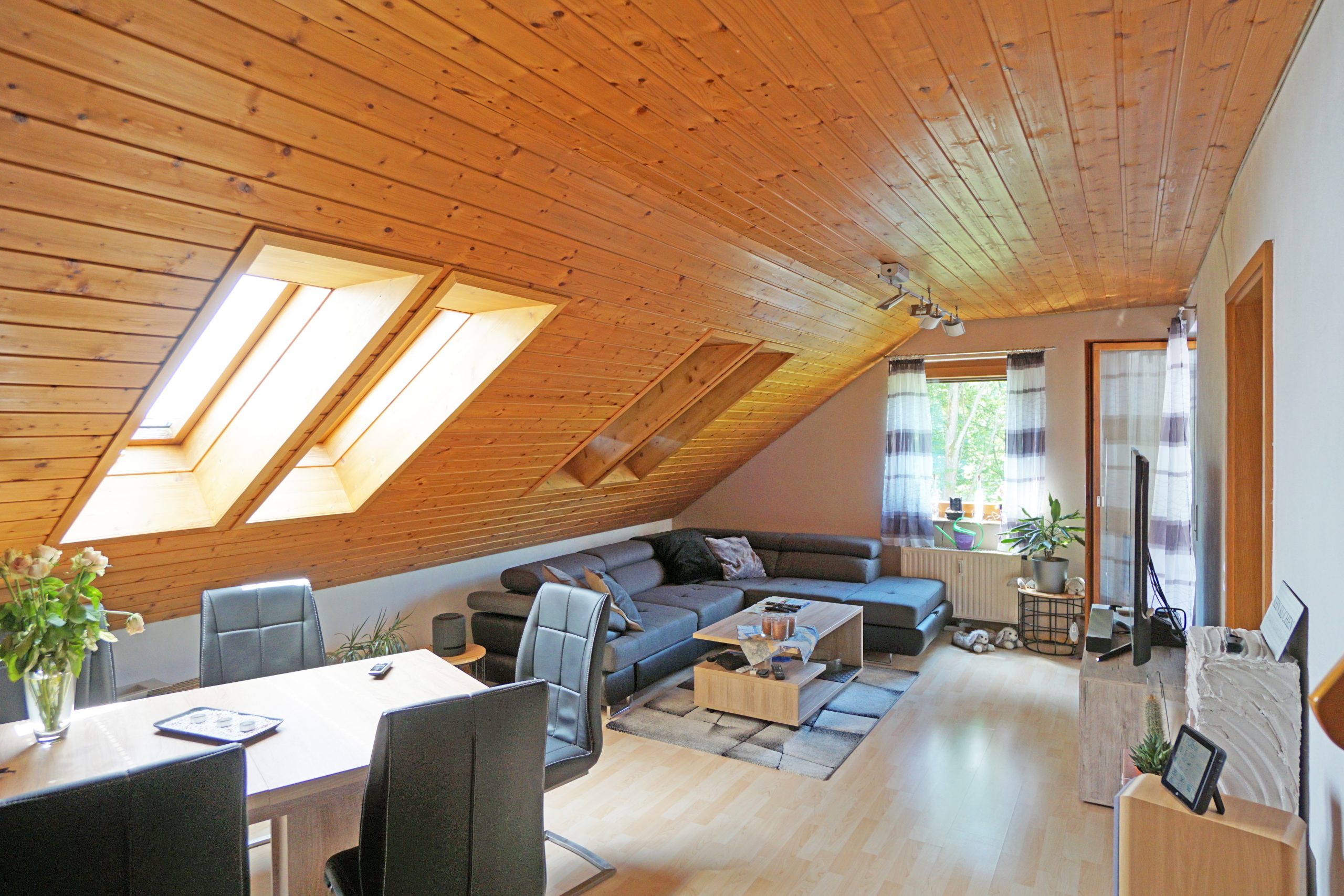 Durch den Eingangsflur gelangen Sie in den großen Wohn-/Essbereich. Die Holzdecke in Kombination mit dem Laminat-Fußboden und vielen Fenstern, verleiht eine helle, sehr harmonische Atmosphäre. Die geräumige Küche mit einer sehr gut ausgestatteten Einbauküche lässt fast keine Wünsche offen und eine große Fenstertür bietet Zugang zum Balkon (West-Ausrichtung) mit idyllischem Bick auf Wald und Wiese.