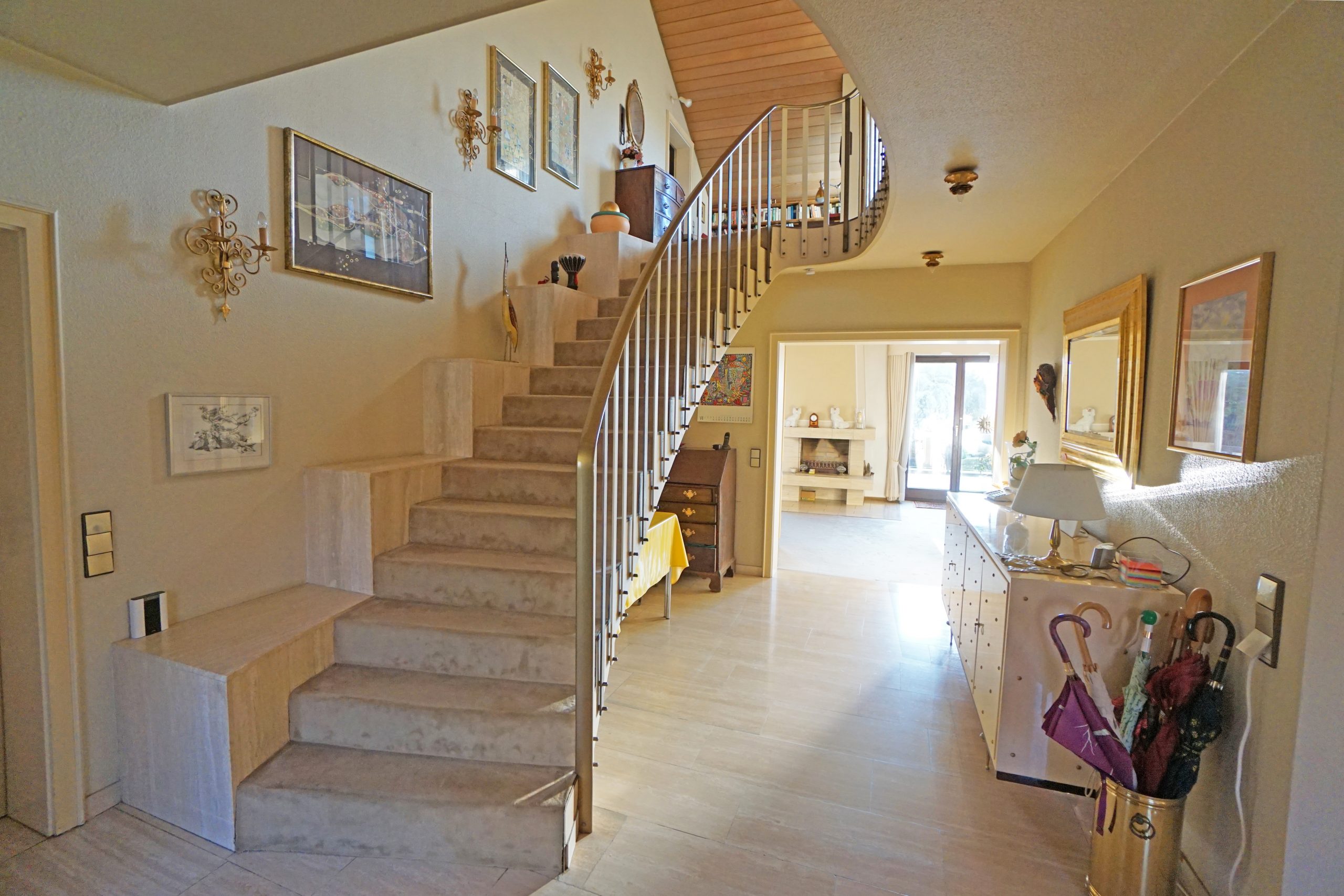 Der Eingangsbereich ist ein Highlight für sich, repräsentativ, Marmorboden (italienischer Travertin), der geschwun-gene Treppenaufgang und die darüber liegende Galerie, fangen viel Helligkeit ein. Der große Wohn- und Essbereich ist sehr weitläufig, wirkt harmonisch und elegant zugleich. Mit bodentiefen Fenstern, dem offenen Kamin als zentralem Element, lässt er auch in Richtung Gestaltungsmöglichkeiten keine Wünsche offen. Die Küche grenzt direkt an den Essbereich, bietet reichlich Platz und ist ausgestattet mit einer komfortablen Einbauküche. Außerdem befindet sich auf dieser Ebene ein großes Kinderzimmer sowie ein Duschbad mit Waschbecken und Toilette.
